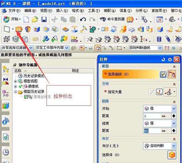 2、拉伸命令,在繪制矩形,不規則形狀等立體模型時,最常用的命令,也是整個UG建模最常用的命令。能夠通過繪制的二維圖形拉伸一定距離,建立三維的立體模型。
