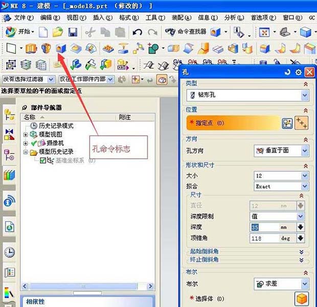 4、孔命令,所謂孔命令就是在已經繪制的三維模型上打孔,有各種孔的形式,有螺紋孔,標準孔,鉆型孔等。