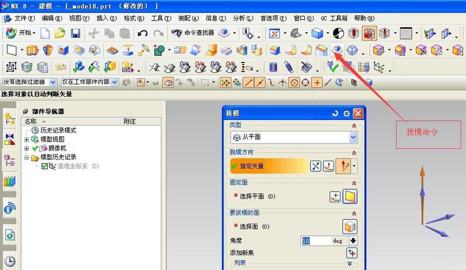6、拔模命令通過拔模命令能夠對模型進行一定角度的拔模,以便開模,在模具設計時經常用到。