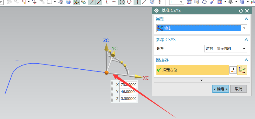 2、以線的端點為基點,創建一個CSYS坐標,等下要根據這個坐標來繪制圖形;