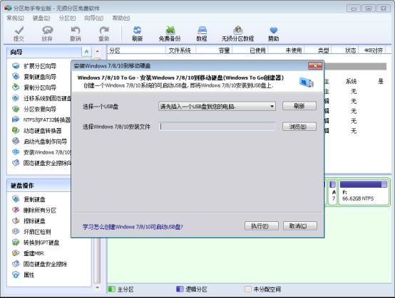 安裝Windows7/8/10到移動硬盤向導是幫你創建一個Windows7/8/10系統的可啟動優盤,也就是做成可移動版的Windows,隨身帶在優盤上,即插即用你自己的Windows。這個向導是對微軟Windows 8企業版Windows to Go功能的延伸,你不必再買收費的Windows 8企業版了。選擇U盤和Windows安裝文件后即可執行。