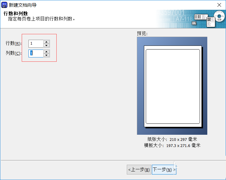 4、到這個地方設置行數和列數的時候,全部設置為1,這樣就是一整張的A4紙了