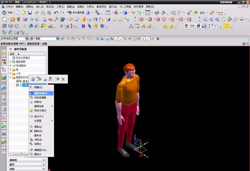 4、如需要改變人體的姿態,請在部件導航器的歷史模型記錄中找到人體,點擊右鍵->編輯參數。