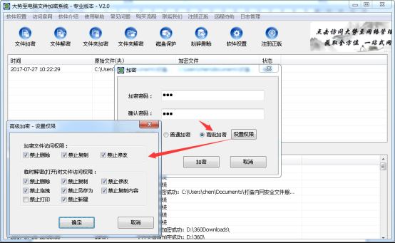例如有一款大勢至電腦文件加密軟件(下載地址:http://www.grablan.com/dnwjjm.html),在電腦安裝完畢之后,就可以對電腦文件或文件夾進行快速加密,并且可以進行三種加密風格,普通加密、移動加密和高級加密,其中高級加密,則可以限制用戶打開加密文件時的訪問權限。如下圖所示:
