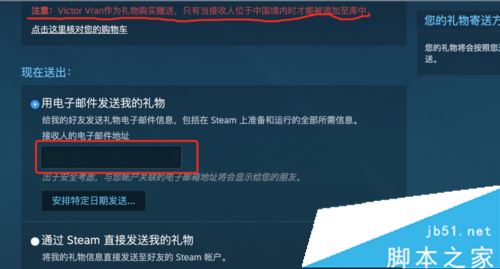 此時該填寫好基友的帳號了。如果對方沒有steam的帳號,可以填寫好友的郵箱,steam會發郵件到該郵箱,對方收到郵件根據提示注冊steam就可以取得禮物了