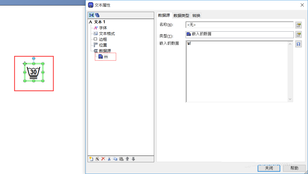 3、然后根據(jù)下圖對(duì)照表,在數(shù)據(jù)源中輸入對(duì)應(yīng)的字符,它就會(huì)顯示相應(yīng)的洗滌圖標(biāo)。