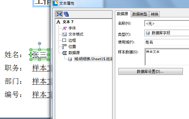 3、為文本添加對應的數據庫字段。以代表“姓名”的文本為例,雙擊該文本,在打開的“文本屬性”中,選擇“數據源”>“類型”>“數據庫”,然后根據向導連接對應的數據庫字段即可。