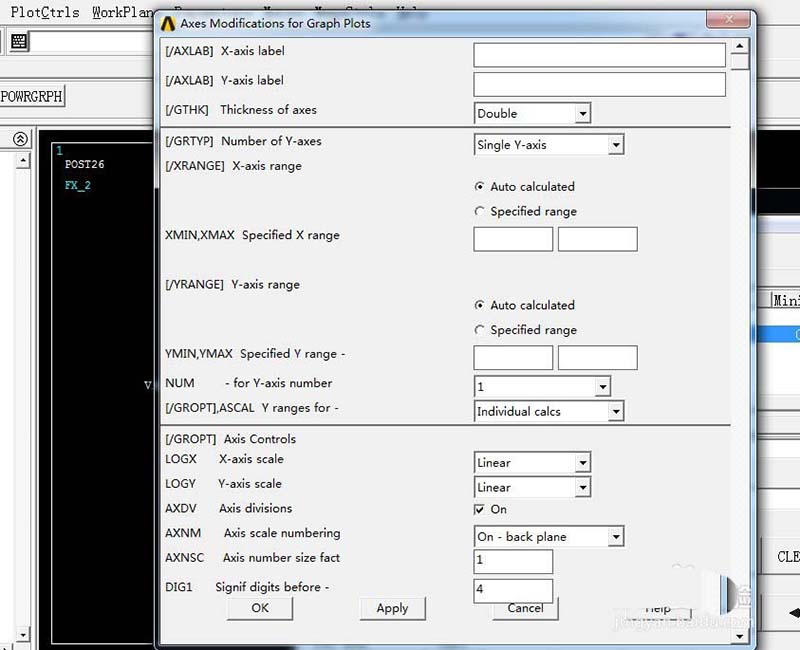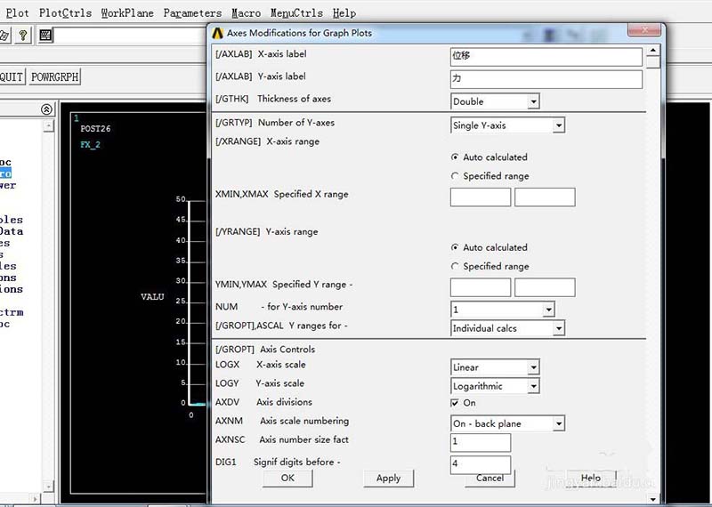 7、在[/AXLAB] X-axis label左邊的框里填寫你所像要顯示的X軸坐標名稱,這里填寫為“位移”,同樣在[/AXLAB] Y-axis label左邊的框里填寫你所像要顯示的Y軸坐標名稱,這里填寫為“力”,填寫好名稱后,點擊左下角的“OK”按鈕即可,如圖
