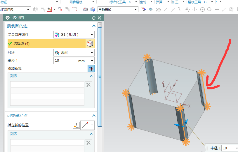 2、使用邊倒圓角命令,為剛繪制的四方體的四條邊線增加倒圓角特征;(其目的是為了使體的面存在相切,以便等下快速地選擇)
