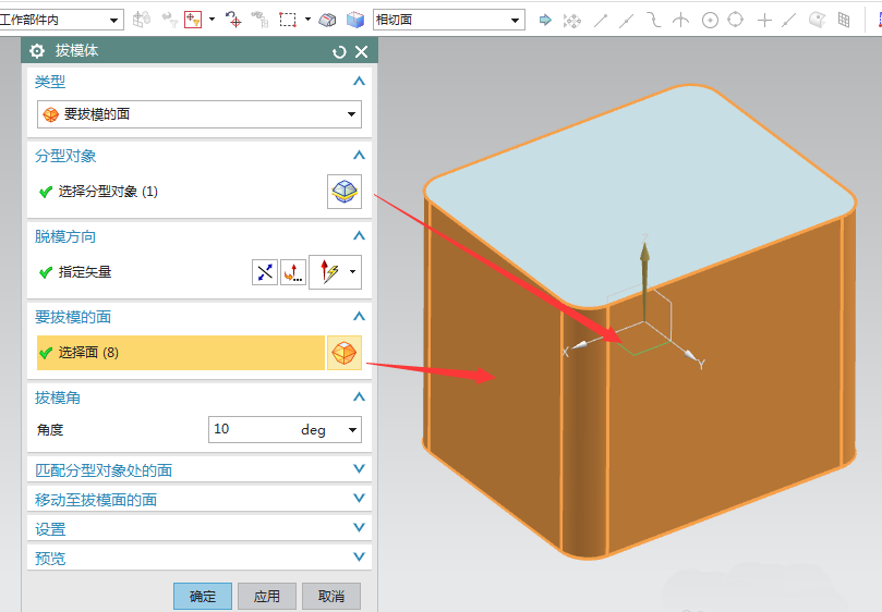 7、設計心德:一般的設計中,我們都是使用拔模來為零件增加角度,很少使用拔模體,不過當遇到可以使用拔模體的零件時,使用其可以快速地為所創建的面增加拔模。