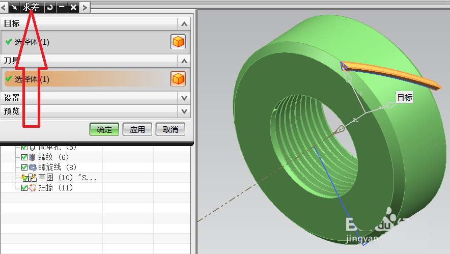 7、把調節螺母毛胚和剛才做的掃掠零件 使用布爾操作中求差,求差后毛胚表面生成一個細長的V型面(其實就是三角形的角在滾花表面沿螺旋線切出來的痕跡)