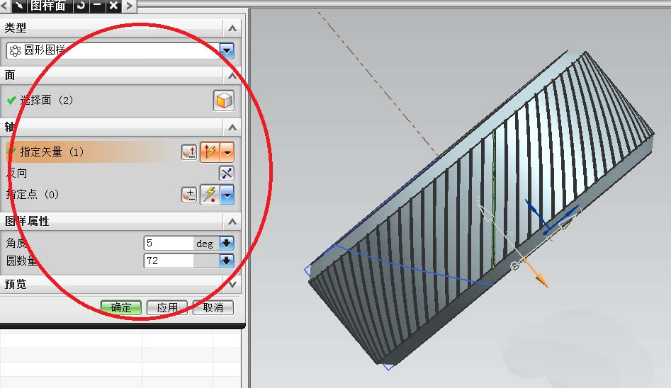 10、然后在彈出窗口中填好一系列信息,可以看到小編填的數據面,選中那個V型面,它是有兩個面組成的軸,選擇中心軸。小編把角度設置的是5°,72個剛好是360°。完成后的效果如圖所示。這樣就完成一半了