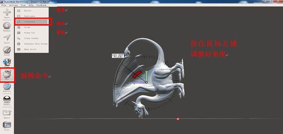 第二步:調(diào)整模型打印方向,點(diǎn)擊左側(cè)菜單欄Edit >transform,會出現(xiàn)旋轉(zhuǎn)坐標(biāo),按住坐標(biāo)旋轉(zhuǎn)至您需要的角度,