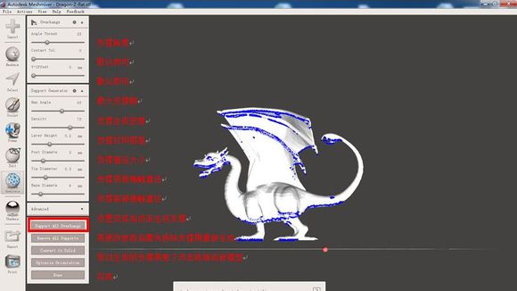 第四步:生成支撐結(jié)構(gòu),在操作完以上步驟后,點(diǎn)擊done,回到analysis菜單,點(diǎn)擊overhangs,調(diào)節(jié)支撐結(jié)構(gòu)參數(shù)后點(diǎn)擊supportall overhangs 按鈕生成支撐結(jié)構(gòu),若覺得某處支撐材料不夠,您只需用鼠標(biāo)點(diǎn)擊此處的支撐,軟件便會自動添加上一條支撐條,若覺得某處支撐材料有點(diǎn)多余,那您只需要按住ctrl并用鼠標(biāo)點(diǎn)擊該處支撐就可以了,這條支撐材料就會被去除掉。