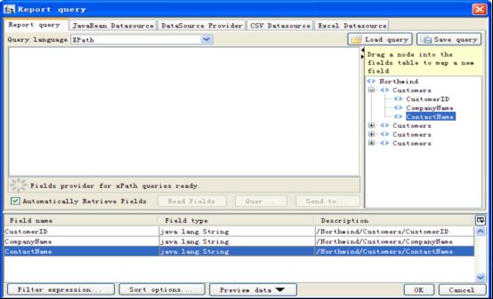 將圖中標(biāo)記的“Customers”拖拽到下方的標(biāo)記處,此處的作用就是要將數(shù)據(jù)源中的數(shù)據(jù)字段添加要ireport中,以便下一步為剛剛建立的“Field”元素指定,查詢語句。如下圖。
