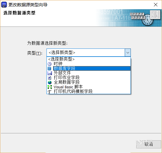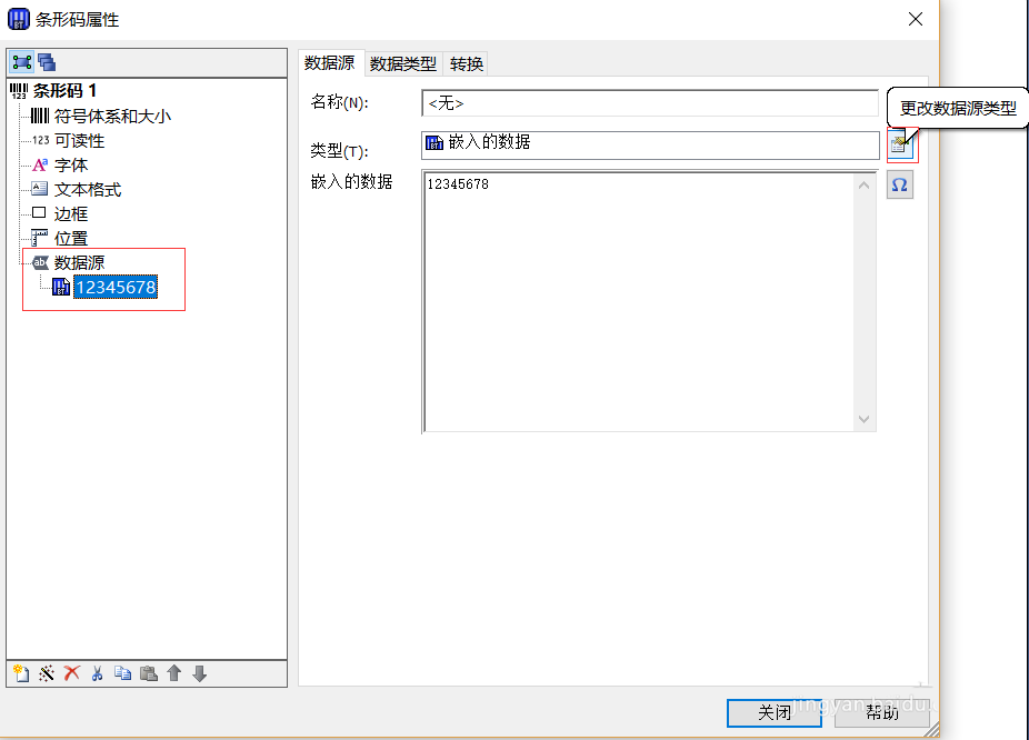 2、雙擊條碼,在屬性對話框中選擇數據源,在類型選項中點擊更改數據源類型按鈕。