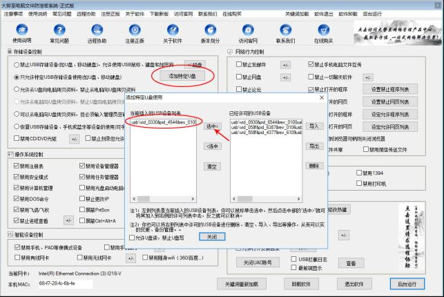 插上U盤,勾選“只允許特定USB存儲設備使用”,點擊“添加特定U盤”,在彈出的窗口中將左側序列號選中(插上U盤后自動顯示),添加至右側列表,然后關閉窗口。設置完成后,這臺電腦就只能識別許可列表中的U盤,其它U盤插入電腦后則不顯示。U盤列表可以批量導入或導出。