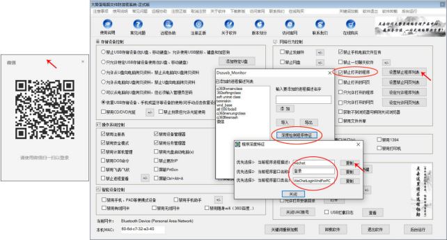 勾選“禁止打開的程序”,點擊“設置禁止程序列表”,在彈出的窗口中輸入關鍵詞,例如“微信”,添加至左側列表,然后關掉小窗口,立即生效,打開微信程序,會立刻閃退。設置“只允許打開的程序”方法相同。如下圖:
