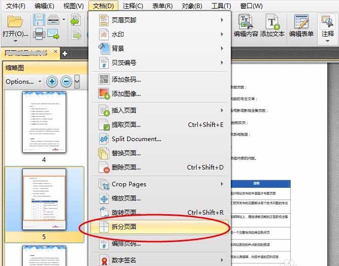 2、在文檔菜單中選擇“拆分頁面”命令,打開拆分頁面對話框。