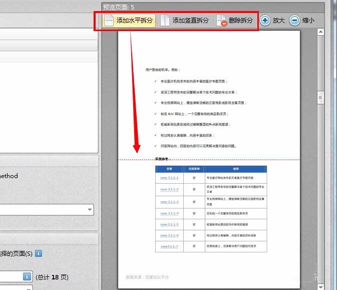 4、在預覽頁面中可以看到需要拆分的頁面,根據要求點擊添加水平拆分或者垂直拆分,就會在預覽頁面中添加水平或垂直的拆分線,不需要的拆分線可以選擇后點刪除拆分。