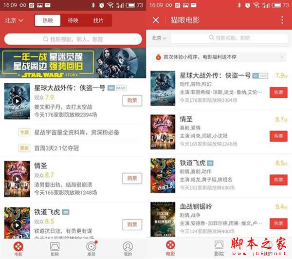 和貓眼電影App相比,貓眼電影的小程序算得上是功能齊全,基本的訂票買票功能一覽無余。但是待映和找片欄目隱藏,如果想要對已經下架的影片進行評論和評分的話還要手動搜索。