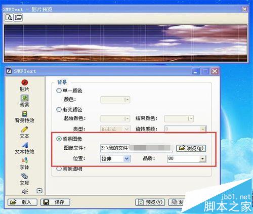 3、背景:可以設置單一顏色,漸進色,也可以設置一張圖片做背景以及透明。在這我們選擇圖片作背景,如圖效果。