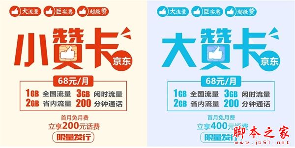 具體來講,京東大贊卡/小贊卡套餐費每月68元,6GB流量包括1GB國內流量、2GB省內流量、3GB閑時流量,國內長市合一通話時長為200分鐘。首月免月租費。