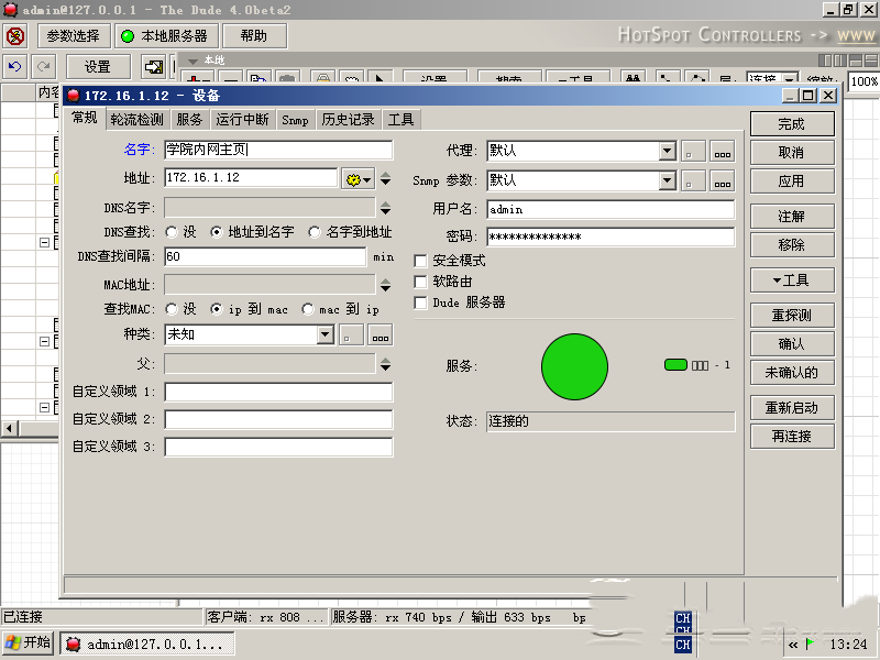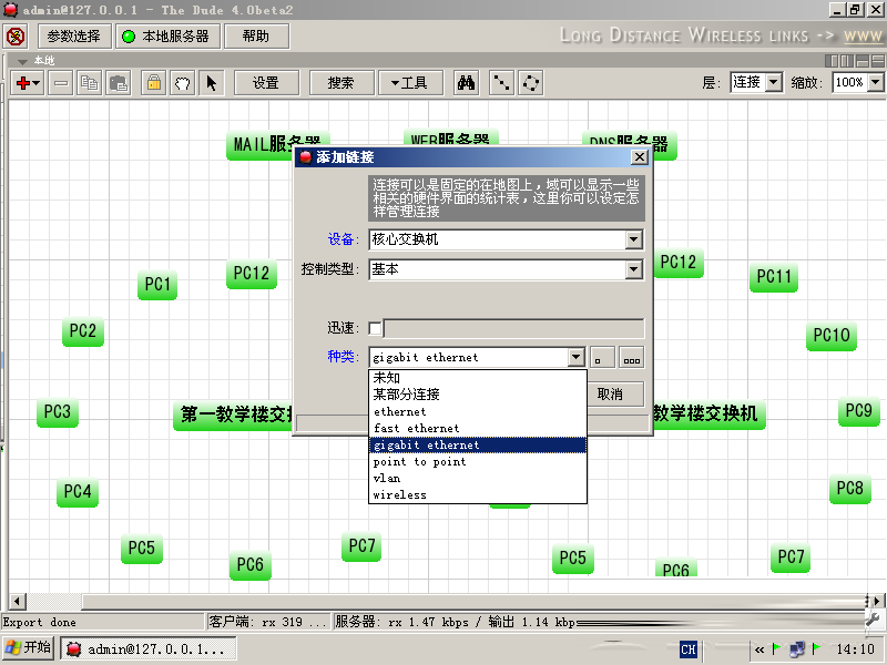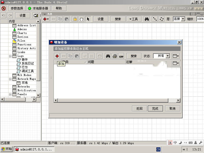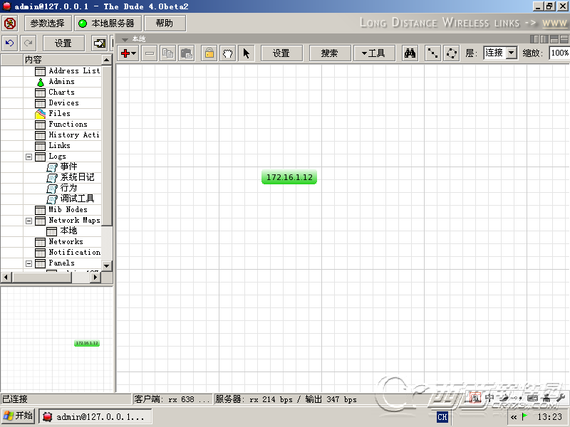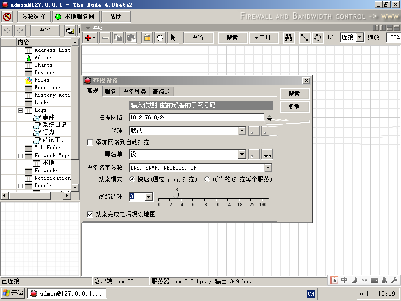 The Dude是MikroTik開發的一款免費的網絡管理與監控軟件,能有效提高你對網絡設備的管理和監控能力。 能自動搜索在指定子網內的所有設備,繪制并生成你的網絡拓撲圖,監測你設備的服務端口。