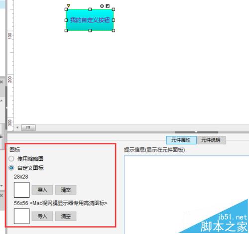 6、編輯元件。打開“普通按鈕”頁(yè)面,在頁(yè)面上完成按鈕的樣式以及交互,然后保存。需要說明的一點(diǎn),元件的位置可以在頁(yè)面上任意位置,不必放在左上角頂點(diǎn)處,Axure會(huì)自動(dòng)計(jì)算出元件的實(shí)際位置,在元件使用的時(shí)候沒有任何影響。你可以為自己的元件制作兩張尺寸分別為28*28和56*56的圖標(biāo),在頁(yè)面屬性面板選擇自定義圖標(biāo)并上傳。如果沒有,默認(rèn)使用縮略圖,Axure會(huì)自動(dòng)將當(dāng)前頁(yè)面縮略圖作為元件圖標(biāo)。