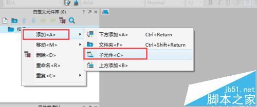 5、添加元件頁(yè)面。右鍵點(diǎn)擊“按鈕”分組,選擇“添加”>“子元件”,命名為“普通按鈕”。你也可以在面板上點(diǎn)擊“+”添加頁(yè)面,此時(shí)的頁(yè)面和分組是同級(jí),只需選中頁(yè)面,按Tab鍵或者點(diǎn)擊面板上綠色向右的按鈕,即可將元件放置在分組下。