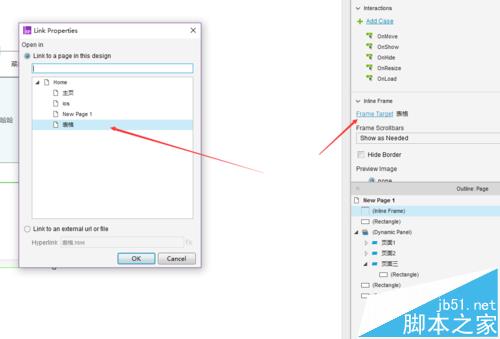 3、現在往框架里填充頁面,選中,點擊frame Target選擇添加的頁面