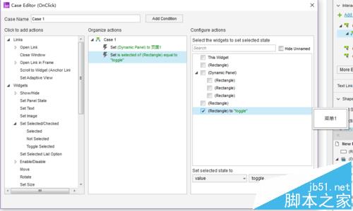 4、其他菜單同理,都設置選中改變背景顏色效果。選中效果設置好了之后要設置觸發選中的事件,選中我們用toggle selected事件,其他兩個一樣的設置