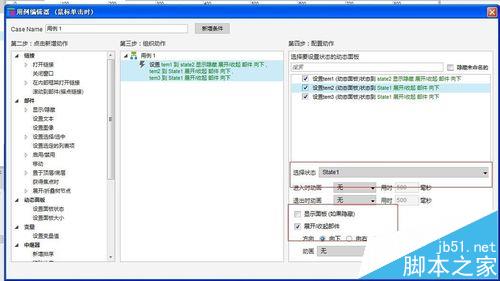 5、對tem1按鈕添加鼠標點擊效果用例。其中需要注意的時,state1狀態和state2狀態的轉換效果。如果設置從隱藏狀態state1到state2效果時,三個模板狀態的勾選。模板如果要選擇的狀態為顯示狀態,則同時勾選“顯示面板(如果隱藏)”和“展開/收起部件”,模板如果要選擇的狀態為隱藏狀態,則只需勾選“展開/收起部件”。對于該頁面內出現的面板都要進行狀態設置