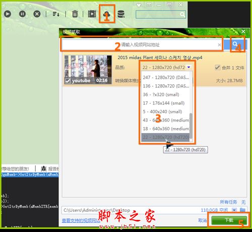 點擊“視頻抓取”輸入你想下載的視頻網址點擊搜索選擇下載的品質點擊下載