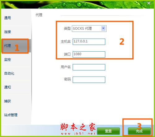 點擊代理選項按下圖填寫類型、主機名、端口點擊完成