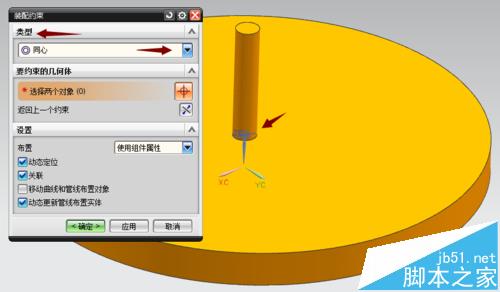 8、點擊確定之后,彈出裝配約束對話框,這里圓盤和直銷的約束,我們第一時間想到的肯定是同心,點擊圓柱的圓形及圓盤孔的圓形完成同心約束。若進行其他約束,通過類型右側的下拉三角進行約束選擇