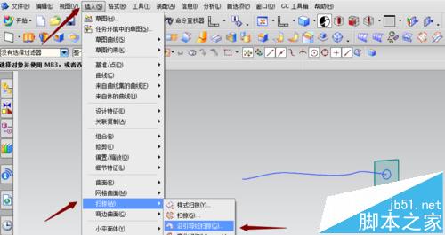 4、繪制完成后,退出草圖界面。在ug操作界面菜單欄里點擊插入命令,找到掃掠命令,然后找到沿引導(dǎo)線掃掠。