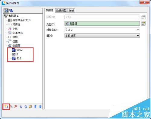 2、雙擊條碼,打開條碼屬性對話框,分別新建數據源9002和812,調整數據源位置。