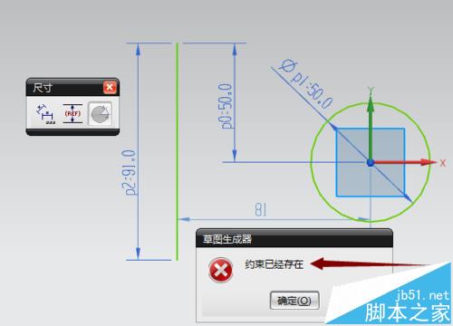 4、對于已經(jīng)編輯過的尺寸,只能點擊尺寸進行修改不能進行圖形識別改尺寸,因為已經(jīng)進行約束。如圓的直徑50,已經(jīng)完成尺寸編輯,使用圖形識別再次進行尺寸編輯,識別之后點擊左鍵確定,彈出尺寸已經(jīng)約束對話框