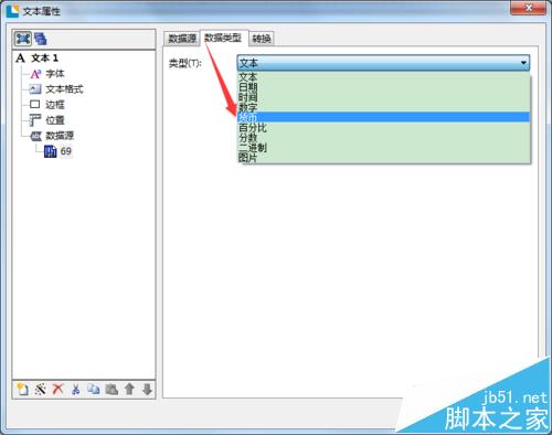 2、接下來,就要將此單價轉換成貨幣格式了。雙擊文本對象。打開“文本屬性”對話框,切換到“數據類型”選項卡,單擊“類型”,在彈出的下拉菜單中選擇“貨幣”。