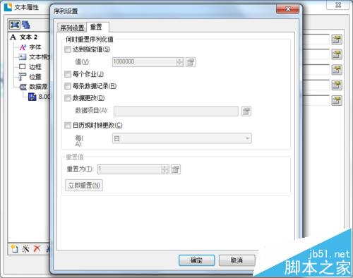 3、序列化設置完成后,接下來就要實現BarTender 2016序列化循環打印了,小伙伴們要仔細看了。打開文本屬性中的“序列化設置”對話框,切換到“重置”選項卡。