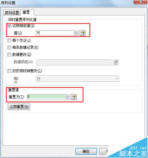 4、“重置”選項卡中勾選“達到指定值”,并將指定值設置為16,“重置值”設置為8,單擊確定。設置已全部完成,打印預覽確保準確無誤。