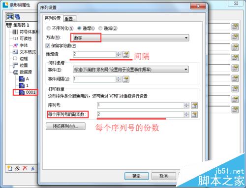 3、“0001”實(shí)現(xiàn)0001, 0001 ;0003 ,0003;0005,0005;……序列變化,就是每列印兩張相同的標(biāo)簽之后,序列遞增2。具體設(shè)置請(qǐng)參照下圖中的設(shè)置。