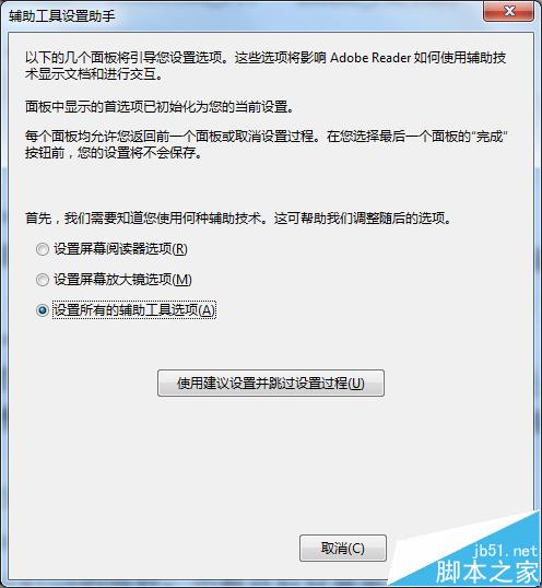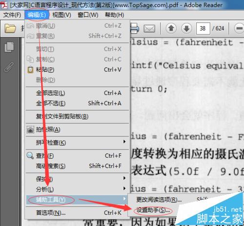 1、首先你要安裝Adobe Reader,打開軟件依次點擊編輯→輔助工具→設置助手,如圖所示: