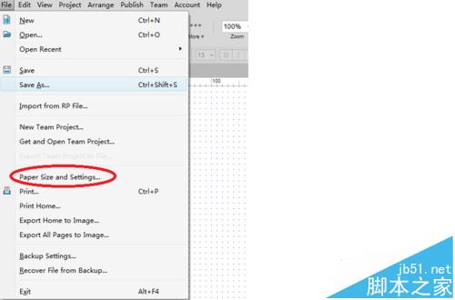 1、打開Axure RP 8.0軟件,執行“File--->Paper Size and Settings..."命令,如下圖所示: