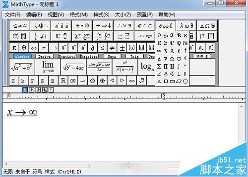 1、打開MathType公式編輯器,進入到公式編輯窗口進行相應的編輯,比如x趨近于無窮。打開MathType公式編輯器的方式可以按照自己的習慣來,對編輯公式的過程及結果沒有影響。