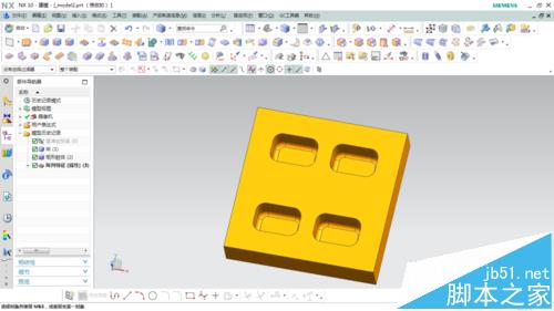 在軟件中做腔體特征的命令很多,像拉伸求差、抽殼等,但一般情況都只能做單一的特征出來。這里要講的是在UG NX軟件中使用腔體命令將周邊底面圓角一次成型的技巧,同時結(jié)合了一次性雙向陣列的使用。