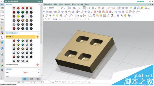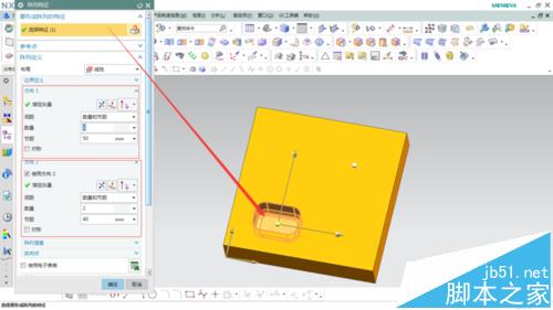 4、選擇陣列特征命令,選取方向1和方向2兩個相互垂直的方向,設(shè)置移動距離,選擇生成的腔體特征,完成后添加材料,效果如圖