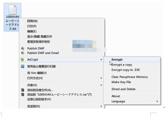 AxCrypt 的使用十分簡單,安裝完成后,鼠標右鍵點擊要需加密的文件,就會出現 AxCrypt 的選項,點擊“Encrypt”即可給文件加密了。如果希望加密之后的文件可以在未安裝 AxCrypt 的機器上使用的話,可以選擇“Encrypt copy to .EXE”(加密成.exe文件) 就可以了。