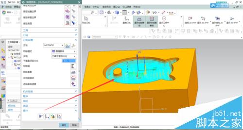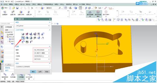 3、選擇加工工序,點擊平面銑中的清理拐角銑削。選取部件邊界,分別選中槽邊界和中間圓柱島嶼,材料側分別為外部和內部。選取底面為槽底。